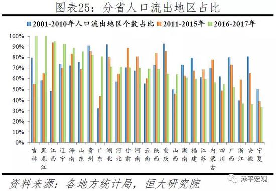 分地区看,东北地区人口流出地区个数占比从68.4%激增至97.7%,东部地区从57.8%增至68.5%,西部地区从65.9%增至69.4%,只有中部地区从67.4%微降至66.4%。东部地区人口流出地区个数逐步上升,2001-2010年、2011-2015年、2016-2017年分别为290、313、344个,占比从57.8%增至68.5%;中部地区人口流出地区个数先升后降,三个时间段分别为377、395、371个,占比从67.4%微降至66.4%;西部地区人口流出地区个数三个时间段分别为578、568、609个,占比从65.9%增至69.4%;东北地区人口流出地区个数近年急剧上升,三个时间段分别为117、109、167个,占比从68.4%增至97.7%,几乎全域人口流出。由于东北地区缺失常住人口地区最多,我们的判断标准可能存在少许高估,但黑龙江、辽宁、吉林人口先后从2014、2015、2016年开始人口陷入负增长,核心城市人口也负增长或基本持平,高估的空间不大。分省看,扣除京津沪和缺失数据较多的新疆、西藏、青海(东北三省、江西、山东也有少量地区剔除),吉林、黑龙江几乎全境人口流出,然后依次为江西95.1%、辽宁92.5%、海南88.9%、山东85.6%、贵州82.1%、广东80.8%。广东作为我国第一经济强省,其人口流出地区占比高主要是因为内部发展差距巨大,珠三角发达地区对粤西、粤东、粤北人口有强大吸引力。