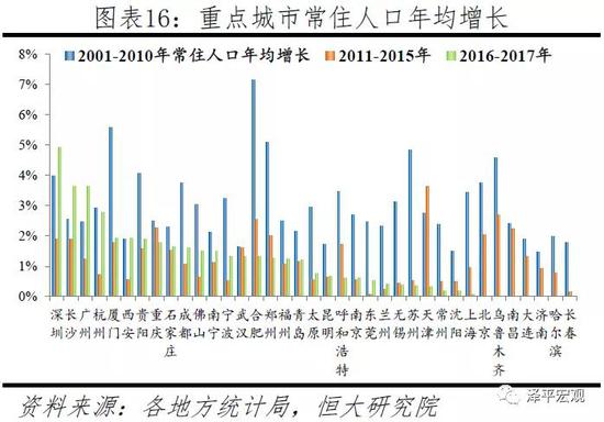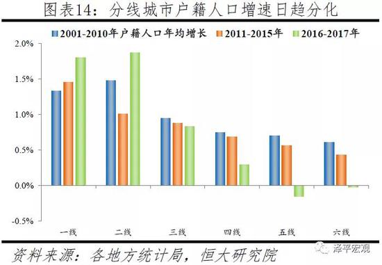 在2010年后,随着户籍制度改革深入推进,分线城市户籍人口增速的梯度分化显化。2011-2015年一二线户籍人口年均增速分别为1.45%、1%,因户籍政策较严,稍低于同期常住人口增速的1.5%、1.3%;而三四线城市户籍人口年均增速分别为0.9%、0.7%,已高于同期常住人口的0.8%、0.5%。五六线户籍人口年均增速分别为0.6%、0.4%,对应的常住人口增速分别为0.2%、0.3%,表明户籍人口外流仍不如常住人口显著。2016-2017年,受城市“抢人”大战的影响,一二线户籍人口年均增速分别为1.8%、1.9%,较2011-2015年大幅提高,一线城市涨幅未超过二线城市是因京沪控人;三线城市户籍人口年均增速为0.8%,较2011-2015年仅微弱下降;而四五六线户籍人口年均增速分别为0.3%、-0.2%、0,较2011-2015年明显下滑,且显著低于对应的常住人口增速0.7%、0.4%、0.4%,表明户籍人口加速流出且流出速度明显快于常住人口。