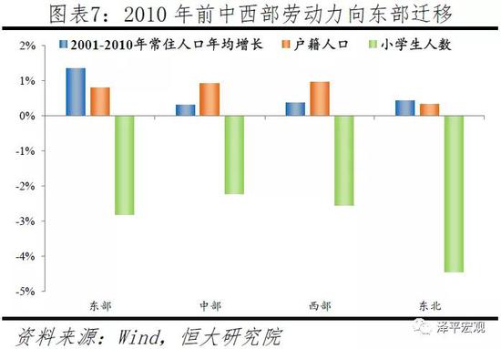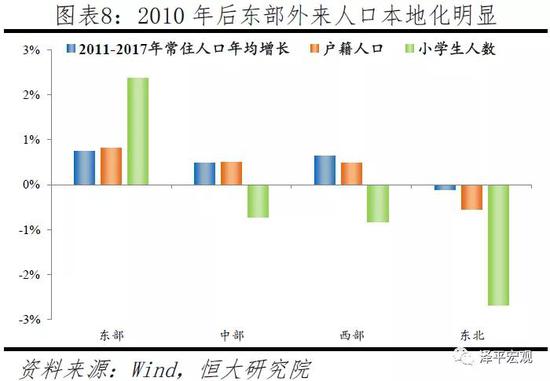 2010年左右以来,部分人口回流中西部,东部地区面对用工压力主动推进大学毕业生、技能人才等外来人口本地化,户籍人口和小学生增速明显加快,东北地区人口加速流出。2009年在长三角和珠三角地区务工的外出农民工占全国外出农民工比例分别比上一年下降2.4%和7.6%,2009年下半年东部沿海地区出现明显的“用工荒”;2013-2017年高校毕业生在东部地区就业规模虽持续增长,但占比从65.7%降至56.7%(参见麦可思研究院《中国大学生就业报告》)。面对用工压力,东部地区主动深化户籍制度改革、吸引外来人口安居乐业。2011年起以鞋服产业闻名全国的晋江在福建率先实行零门槛“居住证”制度,并于2013年率先实行“无房也落户”政策。在2014年国务院要求进一步推进户籍制度改革后,2015年福建宣布全面放开除福州、平潭、厦门外地区的落户限制;广东宣布,除广州深圳外,放开直系亲属投靠,放宽大专以上(含大专)学历毕业生及技能人才、特殊专业人才入户条件等。2011-2017年,东部、中部、西部、东北地区常住人口分别年均增长0.74%、0.48%、0.63%、-0.1%,常住人口占比分别变化0.6、-0.1、0.2、-0.3个百分点。尽管东部地区常住人口增长率明显下降,但其户籍人口和小学生增长率却不降反升。2011-2017年,东部、中部、西部、东北地区户籍人口分别年均增长0.82%、0.5%、0.48%、-0.54%,户籍人口占比分别变化0.7、0、-0.1、-0.6个百分点。东部、中部、西部、东北地区小学生数分别年均增长2.38%、-0.72%、-0.83%、-2.69%,小学生数占比分别变化5.2、-2、-2.2、-1个百分点。其中,2014-2017年东部地区在常住人口年均增速较2011-2013年下降0.02个百分点,但户籍人口年均增速反而上升0.22个百分点。