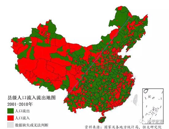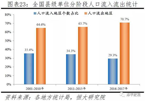 扣除数据缺失导致难以识别的68个地区,人口流出地区个数持续上升,2001-2010年、2011-2015年、2016-2017年分别为1362、1385、1491个,占比从64.6%先增至65.7%,又继续增至70.7%;人口流入地区个数持续下降,上述三个时间段分别为747、724、618个,占比从35.4%先降至34.3%,又继续降至29.3%。