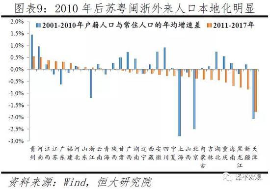 分省看,2010年后苏粤闽浙等东部省份外来人口本地化明显,鄂川皖湘桂等传统民工输出大省人口回流明显,黔豫冀等传统民工输出大省也有所回流,东北三省中黑龙江人口形势最为严峻。2011-2017年,户籍人口与常住人口的年均增速差为正的有贵州、河南、江西、江苏、广东、福建、河北、山东、浙江、云南、青海等11个省份。其中,贵州、河南、江西、河北、云南为传统农民工输出省份,2001-2010年户籍人口年均增速均高于常住人口增速,2011-2017年只是延续这一态势,但户籍人口与常住人口的年均增速差收窄表明外出劳动力有所回流。人口回流更为明显的则是湖北、重庆、四川、安徽、湖南、广西等省,常住人口增长于2011-2017年超过户籍人口增长。而江苏、广东、福建、浙江在2001-2010年户籍人口年均增速均小于常住人口增速,表明大量吸引外来人口流入;2011-2017年户籍人口年均增速开始大于常住人口年均增速,表明外来人口户籍本地化。与此同时,2011-2017年江苏、广东、福建、浙江等东部省份的小学生数年均增速明显高于0.2%的全国平均增速,表明大量外来人口在东部定居后逐渐随迁子女到当地入学。此外,东北三省常住人口、户籍人口增速在2011-2017年均转负,黑龙江的小学生数增速更为全国倒数第一。