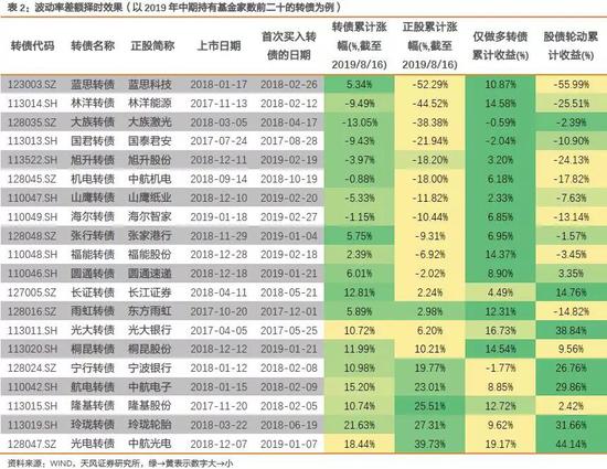 进一步选取2019年中期持有基金家数最多的20只转债进行回测,发现如果正股累计跌幅越深,则仅做多转债的累计收益是最高的,该策略不仅使用相对抗跌的转债对正股进行了替代,还利用波动率差额择时以空仓回避转债的下跌行情;而股债轮动策略受正股的拖累,回测效果不佳。相反,如果正股累计涨幅越大,则股债轮动的累计收益往往是最高的,该策略不仅能享受到正股上涨的行情,还能切换至转债来应对正股的下跌;而仅做多转债因转债跟涨能力有限且有空仓期,累计收益较低。