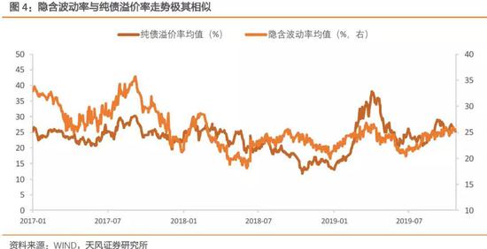 由B-S模型可知,当其他参数不变,隐含波动率与转债实际期权价格正相关,而期权价格就是纯债溢价,期权价格与债底的比值就是纯债溢价率。因此隐含波动率与纯债溢价率走势非常相似,反映了某个时点上转债平均价位与债底的距离。作为估值指标,相较于纯债溢价率,隐含波动率可能更优秀,因为前者除了溢价还会受债底的影响,而后者仅反映转债溢价水平。