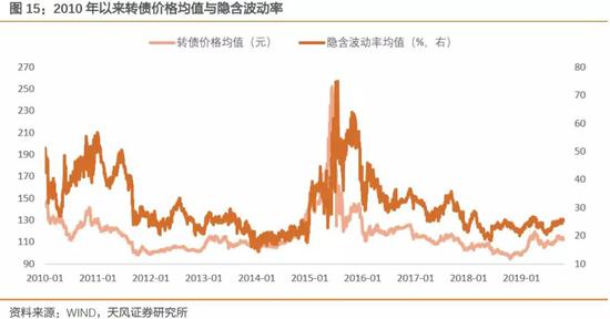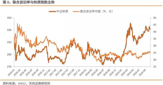 作为估值指标,隐含波动率预示着整体转债资产的价位所处的历史水平。隐含波动率处于低位的时点,就是布局转债的最佳时点,因为此时转债市场也往往处于底部。当未来隐含波动率增大,意味着转债市场进入右侧上行区间,则投资者可以进入收获期。