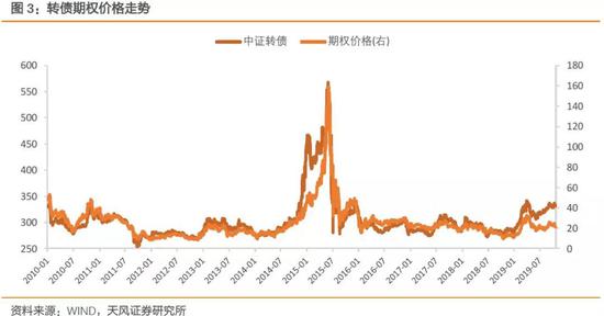 常用的期权定价模型包括B-S模型(Black-Scholes)和二叉树模型(蒙特卡洛模拟实现),通过模型能得到期权的理论价格,与期权的实际价格存在偏离,后者通常是由市场供求决定的。转债内嵌期权的价格可以简单地通过转债价格减去债底得到,由于债底相对稳定,期权价格走势基本与转债指数吻合,趋势非常接近。