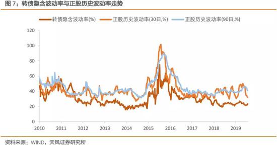 转换价值和隐含波动率负相关。随着平价的提升,转债隐含波动率将逐渐缩小,截至2019年10月24日,平价80元以下、80~100元、100~120元及120元以上的转债隐含波动率分别为30.72%、24.84%、21.02%和24.23%。我们认为平价是通过影响期权的时间价值进而影响隐含波动率,如前所述,转债期权的时间价值是用转债价格与平价之间的距离来衡量的,即转股溢价率某种意义上反映了期权的时间价值,是投资者对未来正股上涨的预期程度。对于高平价转债,存在130元的“平价顶”,转股期权几乎肯定会被执行,此时时间价值趋于零,隐含波动率承压;而对低平价转债,包括下修在内的促转股措施将使得未来收益想象空间较大,此时时间价值也较大,刺激隐含波动率上行。