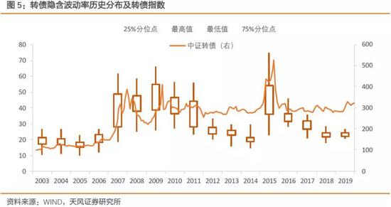 从转债隐含波动率的历史分布来看,充分吻合转债指数的走势。自2003年以来,隐含波动率的历史最高点为2015年大牛市的75.06%,此外2007年10月、2009年7月和2015年底的牛市行情中,隐含波动率都突破了60%,历史最低点出现在2005年8月的10.03%,历史均值为30.15%,中位值为26.07%。2017年以来的均值为25.50%,中位值为24.45%,截至2019年10月24日,隐含波动率为25.15%,位于历史46%分位水平,位于2017年后的57.6%分位水平。