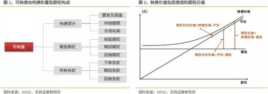 可转债作为一种含权债券,通常被视为纯债+看涨期权的结合。纯债部分是使用可比企业债的到期收益率将预期现金流进行贴现得到,主要决定变量包括票息、期限和市场利率;看涨期权比较复杂,主要是指转股期权,即转债投资者有权利将债券转换为股票。但实际上除转股权外,转债还内嵌赎回期权、回售期权等,目前尚无合适的定价模型,我们将简化讨论,将转债内嵌期权视为一个整体。