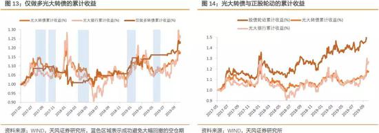 1)仅做多转债:自2017年5月25日发出第一个买入信号建仓以来,直至2019年10月24日,利用波动率差额择时,仅做多光大转债的累计收益为23.31%,而光大转债累计收益为17.66%,正股累计收益为26.76%。从回撤来看,正股和转债大幅下跌的时期,策略基本都是空仓以待,因而即便是正股暴跌的2018上半年,策略的最大回撤也仅为9.5%,远低于同期转债和正股的19.1%和29.6%的回撤。证实了波动率差值的择时策略有效。