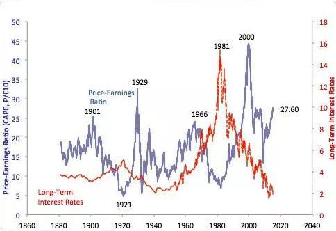 席勒对拐点出现的预测,并不是新闻评论式的。在《非理性繁荣》一书中,他画出了自1860年以来,美国股市的市盈率曲线图,发现在140年的历史上,出现过1901年、1929年和1966年三个峰值点,而历史的事实是,它们都成为了大股灾的前奏时刻。