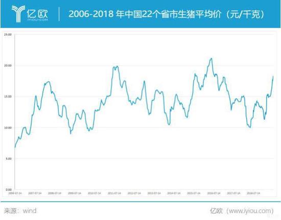 注意下图,2006-2018年中国生猪平均价格统计图,其中三个阶段性的历史价格最高点分别出现在:2008年5月,生猪价格约17元/公斤;2011年9月,生猪价格约20元/公斤;2016年9月,生猪价格约21元/ 公斤。