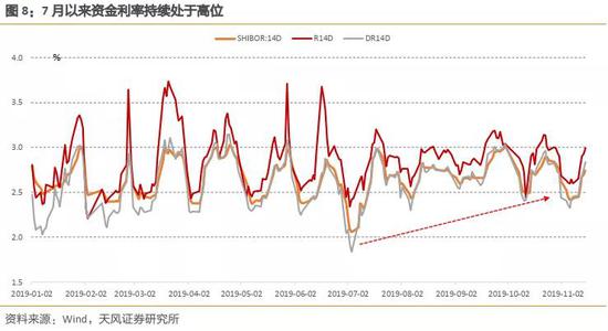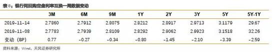 2019年10月中旬以来,Shibor迅速上行,与2018年10月出现的shibor3M上行类似。一方面,监管等结构因素叠加跨年因素,特别是银行负债结构压力推高Shibor。另一方面,央行中性稳健的操作风格,导致流动性并不宽裕,进一步放大了跨年的影响。