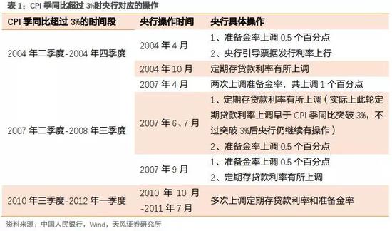 从历史上来看,CPI破3后货币政策不会无动于衷,还是会有一定的应对。从历史数据可以发现,2000年以来只有三个阶段CPI季同比超过3%,并且每次CPI季同比超过3%的首季第1、2个月内,央行货币政策就开始有所收紧。