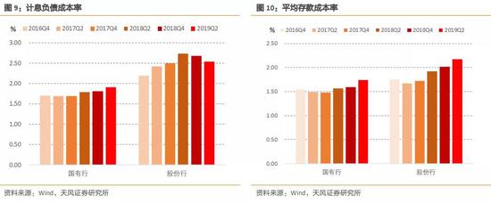 第一,国有大行最近一年计息负债成本,特别是存款成本显著上升。从计息负债成本看,国有行连续上升,股份行18年以来开始下降,但水平仍较高。计息负债以银行存款为主,由于银行存款竞争激烈,对公存款始终徘徊在0附近,存款成本连年上升,平均存款成本率自2017年以来呈上升趋势,国有行的存款成本上升压力十分突出。同业负债是银行,特别是股份行负债的重要来源。从计息负债结构看,股份行同业负债占比在20%以上,国有行在超过10%,存款压力下,同业负债逐渐成为国有大行的负债补充。