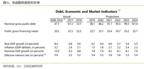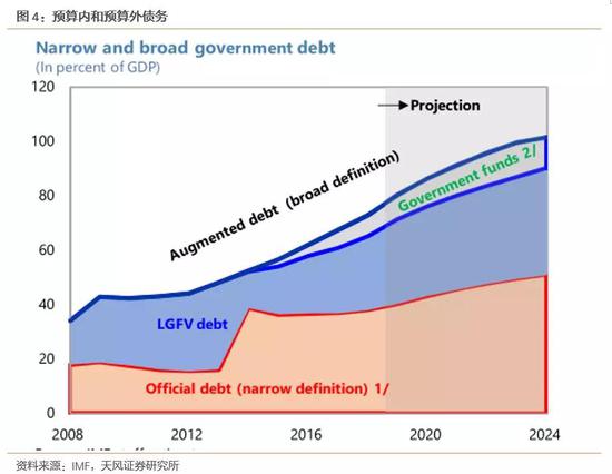 当然,我们的计算方式肯定比较粗糙,这里我们继续借鉴IMF的《第四条磋商报告》。该报告指出,2019年考虑隐性债务后的政府杠杆率为80.1%,预计2024年杠杆率超过100%。