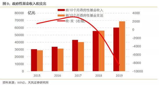 2019年前10个月,如果不考虑专项债收入,政府性基金赤字为8441亿元,如果按照往年比例测算,2019年全年政府性基金赤字可能达到16845亿元。
