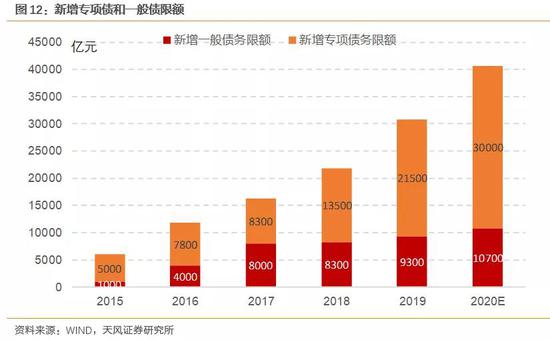 新增债要看新增的债务限额。按照地方政府赤字占比35%计算,净融资额1.07万亿,即为新增的一般债规模。新增专项债规模是财政发力的关键,我们预计2020年新增专项债规模30000亿元。