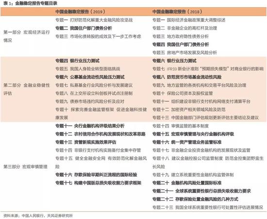 《中国金融稳定报告(2019)》整体结构与2018年相似,全文共17个专题。今年新增的内容主要有债转股、私募基金、人身险、科创板、债券市场违约、金融科技等,反映了近年来的市场发展和监管动向;同时也有一些重复的主题:住户部门债务、银行业压力测试、基金流动性风险压力测试、资管新规、央行金融机构评级、金融机构风险处置以及TLAC;相对而言,重复的主题可能更值得关注。