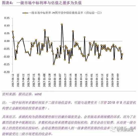 按照这种构造方法,仍然以7年期国开债为例,我们发现在2017-2019年期间,(一级中标利率-公允价值)在多数时候为负值,极值为-15BP,均值为-5BP。