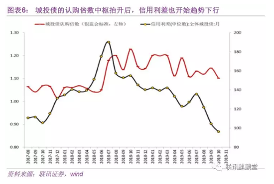 比如以城投(银监标准)为例,2018年7月份后,我们发现公开发行的城投债认购倍数明显上了个台阶,二级市场上城投债的信用利差也出现了见顶压缩的迹象。