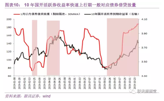 2019年以来,我们就曾经看到2月、4月、8月-9月三个时间段,债券借贷规模出现了明显的上涨,相对应的,这段时间里,10年国开活跃券的到期收益率也出现了明显的上涨。
