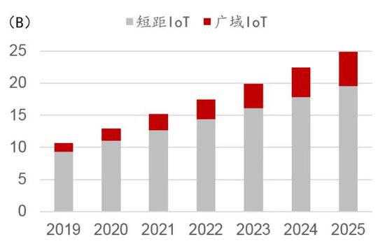 全球物联网终端市场有望保持高速增长。IDC预测,2019年全球物联网支出达7450亿美元,2023年达到11000亿美元。爱立信预计,2025年,全球物联网终端规模达到249亿,其中,短距IoT设备(Wi-Fi、Bluetooth和Zigbee)达到195亿,年均复合增长率13%;广域IoT设备(2G、3G、4G、5G、NB-IoT、eMTC、Sigfox和LoRa)达到54亿,年均复合增长率24%。2025年,广域IoT设备中,NB-IoT和eMTC设备为5G主流物联网终端,占比达52%;4G和5G大带宽物联网终端占比达28%。长期看,物联网终端市场规模远超智能手机市场规模。