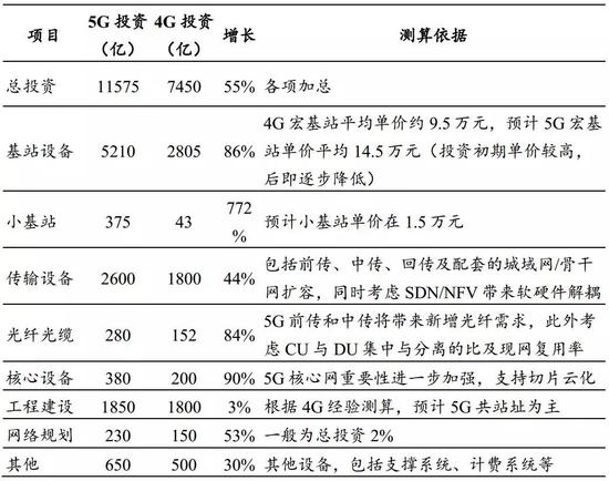 5G投资规模比4G增长50%以上。截止2016年底,4G主要投资期(2013-2016年)共完成315万站基站建设,其中,中国移动4G基站151万站,中国电信4G基站90万站,中国联通4G基站74万站。考虑到5G基站的密度明显高于4G,根据4G网络投资规模进行推算,预计2019-2022年三大运营商共建设400万站5G基站,5G基站建设数量比历史同期4G基站建设数量增长约27%。其中,中国移动200万站,中国电信和中国联通合建200万站。5G基站采用大规模天线技术,基站单价明显提高;5G传输网支持网络切片,传输网需要全部新建。我国三大运营商4G总投资达到了7450亿,根据中信建投证券的推算,我国5G网络投资将高达1.1万亿元以上。与4G网络投资结构类似,最大的资本支出是基站,随后是传输网、核心网和其他运营支撑系统。