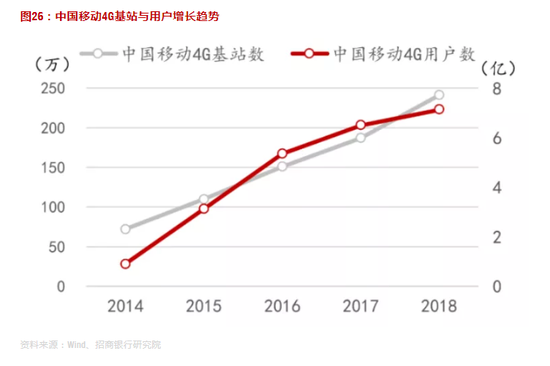 图26:中国移动4G基站与用户增长趋势