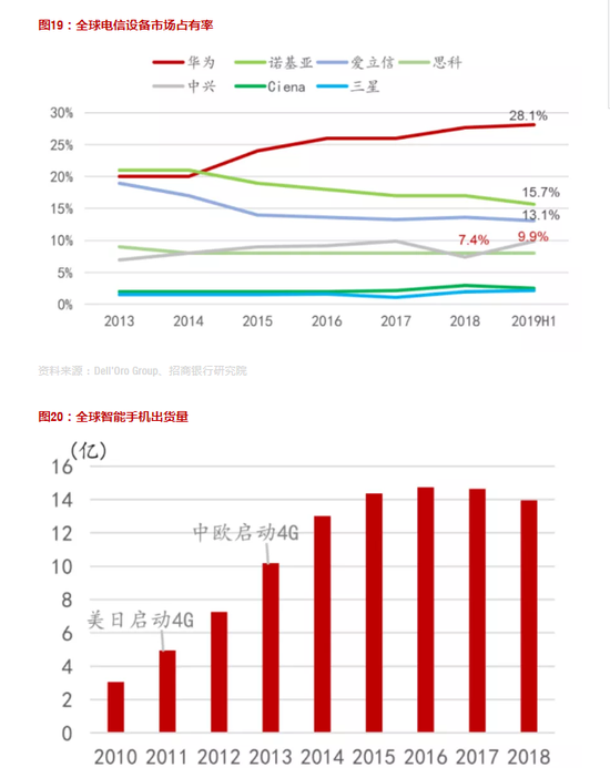 华为中兴在全球通信设备市场具有领先优势。Dell‘Oro发布的全球通信设备市场报告显示,全球七大设备制造商依次为华为、诺基亚、爱立信、思科、中兴、Ciena和三星,这七家公司合计占全球设备商市场份额的80%左右。华为依靠标准和专利领先优势,在通信设备市场份额持续上升,2019H1全球市场占有率达到29%。中兴通讯在2018年经历美国处罚后全球市场份额短暂下滑到7.7%,在2019H1市场份额重新接近历史高点的9.9%。