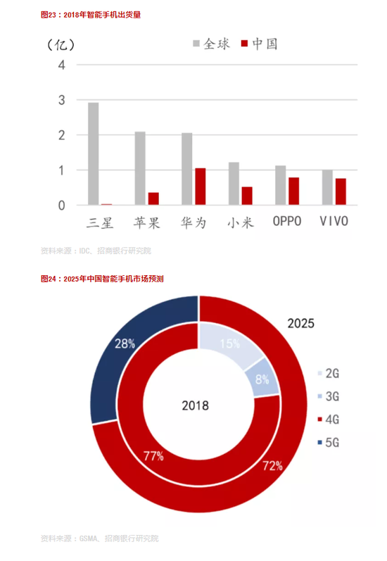 中国是5G智能手机全球最大市场。截至2018年底,中国手机用户数接近12亿,用户普及率达到人口总量的82%,接近欧美发达国家85%的普及率。2018年,全球智能手机出货量为14.56亿,其中中国市场总销量为3.98亿台,占比27%。全球Top6智能手机制造商中,我国华为、小米、OPPO、VIVO占据四席。2019年二季度,华为超过苹果成为全球第二大智能手机制造商。根据GSMA预测,到2025年,全球5G手机市场占有率达15%,其中韩国59%、美国50%,日本48%,欧洲29%,中国28%。到2025年,中国5G手机用户数将超过北美和欧洲的总和,达到4.6亿,成为5G智能手机最大市场。