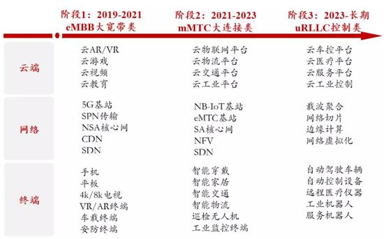 从全球信息产业的发展路径看,万物互联要经历人与人、人与机器、机器与机器三个发展阶段。从5G三大技术场景的发展顺序来看,阶段一 (2019-2021年)以人为先,大带宽(eMBB)应用场景为主;阶段二(2021-2023年)人机互动,大连接(mMTC)物联网应用全面崛起;阶段三(2023年-长期)万物互联,低时延(uRLLC)工业控制类应用陆续成熟。