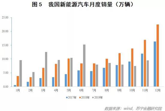 数据显示,2019年1~11月,我国汽车无论是当月销量还是当月产量,与2018年同期相比,几乎呈现清一色的下滑(参见图3、图4),而前11个月累计的销量和产量与2018年同期相比,分别减少了9.0%和9.2%。就连一向坚挺的新能源汽车,其销量在2019年6月以后也出现了极为明显的滑落(参见图5)。