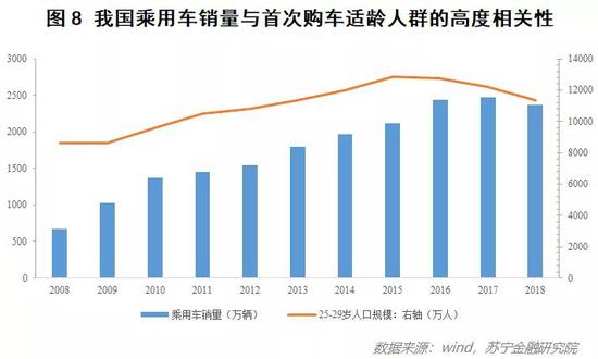 一方面,人口结构正在发生变化。通常情况下,25~29周岁人群被视为首次购车适龄人群,他们正处于成家的黄金年龄与事业上的快速上升期。然而根据国家统计局的数据,自2016年起该人群的规模开始缩减,而受到国人生育意愿持续走低的影响,其缩减之势很可能会长期延续下去。这势必会对汽车市场造成影响——从历史数据上看,历年乘用车销量与首次购车适龄人群规模的走势呈现出较强的一致性(参见图8)。