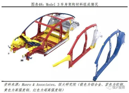 为压缩成本,Model 3车身选择钢铝混合。根据Munro & Associates的拆解报告和车身模型结构图可以发现,Model 3采用铝合金、软钢、高强度钢和超高强度钢这4种材料。由于单电机Model 3为后置电机,为平衡重量,后车身大部分使用质量更轻的铝合金。大部分的纵梁、底板等则采用超高强度钢,增加车身坚固程度以提高安全性。然而,过多的不同类型材料增加连接难度,Model 3车身连接方式便高达5种,且并没有简化不必要配件,反而增加了整车制造成本。