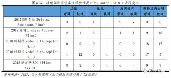 从车道保持情况来看,根据美国公路安全保险协会IIHS数据,在直径1300-2000英尺(396-617米)不同的空旷道路测试环境下,对比宝马5系、奔驰E、Model 3/S和沃尔沃S90五辆同类别轿车,设定3种情况各6种测试的共18次测试条件,Autopilot8.1辅助驾驶系统在弯道和坡道的车辆保持能力最为突出,仅在坡道表现过一次压线。