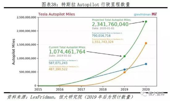 二、Autopilot拥有数据优势。作为最早搭载自动辅助驾驶系统的电动车品牌,同时拥有全球规模最大的辅助驾驶车队,截止2019年1月,特斯拉Autopilot行驶里程超过17.3亿公里,远超其他竞争对手,并且车队规模保守估计以每年约40万辆递增(Model S/X 10万辆/年+Model 3 30万辆/年)。作为对比,根据加州车辆管理局《2018年自动驾驶脱离报告》的数据,激光雷达路线的领头羊Waymo在2017年12月至2018年11月期间的路测车队规模为110辆,路测里程数约200万公里。