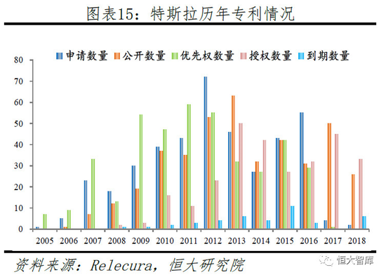美国专利分析公司Relecura数据显示,截止2018年,特斯拉共计专利/专利族408件。从历年情况来看,2009年后,专利申请数量与授权数量开始激增,主要与Model S的研发准备有关,申请数量于2012年到达顶峰,授权数量于2013年到达顶峰。从申请国家来看,美国申请数量保持领先,近年来欧洲与中国申请数量急速增加,这与特斯拉全球化的市场战略分不开。