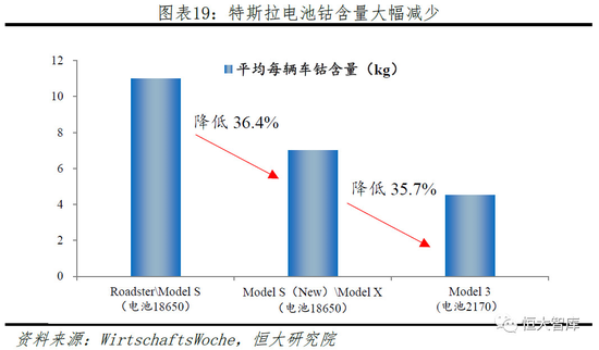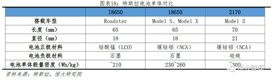 一、不断寻找最优材料,降低成本、提升性能。电池单体化学物质成分和比例的不同将直接影响电池性能表现,三元材料中,镍主要作用为提高材料整体能量密度,钴主要作用为稳定材料层状结构,提高整体循环性能。然而,过高的镍含量会导致化学成分不稳定,过高的钴含量会降低能量和容量,并且由于矿产稀缺性,钴价一直居高不下。为此,特斯拉不断攻克电池材料配比,试图找到最优方案。横向来看,当竞争对手2013年做磷酸铁锂电池与NCM111时,特斯拉已经开始在Model S上应用高能量密度NCA三元电池;当竞争对手2017年开始由低镍材料过渡到NCM622/NCM811高镍正极材料时,特斯拉已经探索更高能量密度的硅碳负极应用,特斯拉在电池技术的积累使其电池能量密度和整车续航里程能领先竞争对手数个身位。纵向来看,特斯拉一直坚持使用NCA作为电芯正极材料,并不断提高镍含量、降低钴含量。对比最新Model 3与Roadster两款汽车,特斯拉平均每款车钴含量降低约60%。根据特斯拉2018年一季度报告,Model 3的电芯能量密度超过其他任何一款竞品所使用的电芯,其钴含量低于主流电芯制造厂即将量产的下一代NCM811电芯产品。