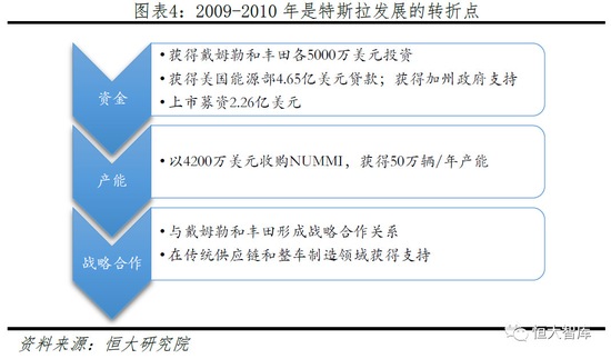 奔驰和丰田的战略投资使特斯拉获得资金与品牌双重背书。2009年1月底特律车展之后,戴姆勒向特斯拉订购了4000颗电池组用于奔驰A-Class车辆测试,并且以5000万美元取得了特斯拉10%的股份,形成了合作伙伴关系。2010年5月特斯拉获得丰田5000万美元投资,取得3%股份。与两家传统车企巨头的战略合作不仅解决了特斯拉资金方面的燃眉之急,更让特斯拉快速学习到生产、管理经验和模式的know-how。此外,特斯拉还以4200万美元低价收购原丰田与通用合资、年产能50万辆的工厂NUMMI,为大规模量产打下基础。