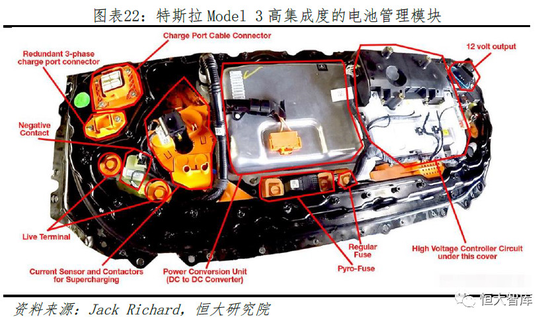 特斯拉的BMS具有两个特点。一、高精度。根据Sandy Munro和Jack Rickard等人对Model 3的拆解,Model 3的BMS可以将23-25个独立电池组的电压差控制在2-3mV,远低于其他普通电动车的水平;二、高集成度。特斯拉BMS模块集成了高压控制器、直流转换器和多个传感器,由此可以减少内部通信所需的高压线束,最终减轻总重量并降低成本。