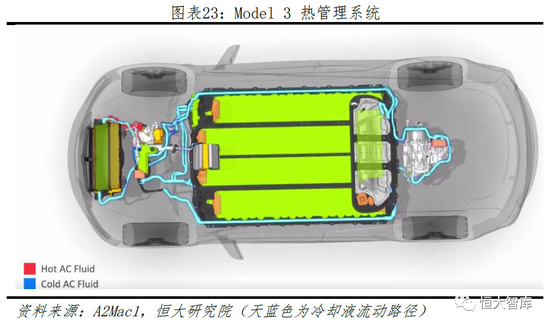 四、热管理系统温差设计合理,冷却路线丰富流畅,均温和能量管控能力突出。新能源汽车的热管理系统主要包括整车、座舱、电池三方面,进行整车温度控制、客舱空调加热制冷、电池过热散热过冷加热等。目前,主流热管理包括自然冷却、液冷和直冷三种方案,特斯拉采取50%水和50%乙二醇为冷却液的液冷方案,由四通阀实现的电机和电池冷却循环串并联结构。由系统芯片算法控制,当电池温度超过设定目标值时,电池循环与电机循环相互独立,采用并联;电池温度低于设定目标值时,电池循环与电机循环采取串联,利用电机余热为电池和座舱加热,多余热量将由进气口的热量交换器排放出去。此方案充分利用车内所有部件热量,使热量有效循环游走,极大提高电池单体散热性和电池单体间温度一致性。因此,无论冬季还是夏季所对应的极端气候,特斯拉车辆温差控制保持在2℃内,体现强大的温度管控能力。