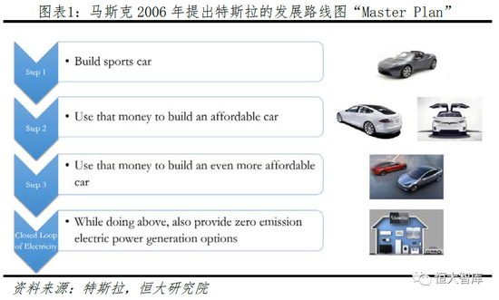 2003年,硅谷工程师艾伯哈德和塔本宁创立电动汽车制造公司,为致敬交流电发明者尼古拉·特斯拉,公司取名为特斯拉(Tesla Motors)。2004年,硅谷新贵马斯克在特斯拉A轮融资中领投650万美元,成为特斯拉最大股东和董事长,并在2006年8月提出贯穿特斯拉发展的路线图“Master Plan”,即“三步走”战略: