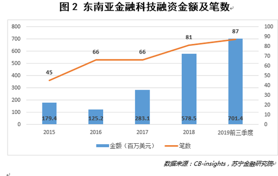 据CB-insights统计数据显示,2016-2018年间,东南亚金融科技融资额从1.25亿美元增长至5.79亿美元,增长率超过350%。而截至2019年前三季度,东南亚金融科技融资额已达7.01亿美元(见图2)。