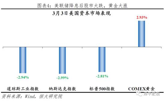 美联储紧急降息效果有限。虽然市场早已预计3月降息50个基点,但是提前降息仍超出预期,且美联储官员一致同意降息,事实上加重了市场对经济形势的担忧。同时市场可能认为货币政策效果有限,无法解决疫情造成的停工停产和消费低迷问题。美国股市在宣布降息后小幅反弹,但随后快速下跌,最终道琼斯工业指数收跌2.94%,纳斯达克指数收跌2.99%,避险资产黄金则收涨2.93%。