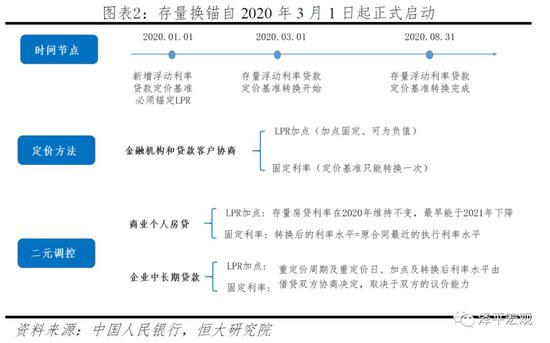 如何换锚:具体来看,存量浮动利率贷款换锚有三大特点:统一定价锚、方法可选、差异化定价居民房贷和企业贷款利率。从时间节点来看,2020年8月31日后,LPR将成为新增、存量浮动利率贷款的统一定价锚,届时贷款基准利率或退出历史舞台。从定价方法来看,存在固定利率和LPR加点两种选择,由金融机构和贷款客户协商决定。从差异化定价来看,住房贷款利率最早在2021年初下降,企业中长期贷款在协商原则下短期内不具备大幅下行空间,且取决于银行和企业的议价能力。新方案延续房地产调控思路,继续巩固房地产与实体企业之间的“防火墙”,落实“房住不炒”调控思路。