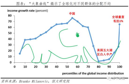 经济学原理告诉我们,因为存在比较优势,自由贸易能使每个人状况更好。从效率角度来看,确实没错,但从公平角度来看,全球化带来了分配问题。“大象曲线”形象地说明了这一点,也揭示了当前“逆全球化”浪潮兴起的原因。在过去几十年全球化浪潮中,受益最大的是中国等成为世界工厂的新兴市场经济体,以及以跨国集团和华尔街为首的富人阶层,美国五大湖区的白人中产阶级的相对状况反而急剧恶化。