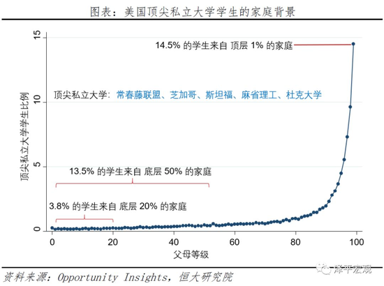 6)教育机会不公平加剧阶层固化,“寒门不出贵子”现象加重。在美国顶尖私立大学(常春藤联盟、芝加哥、斯坦福、麻省理工、杜克大学)中,只有13.5%的学生来自底层50%的家庭,3.8%的学生来自底层20%的家庭,而来自顶层1%家庭的学生却高达14.5%,甚至超过了底层50%的家庭。