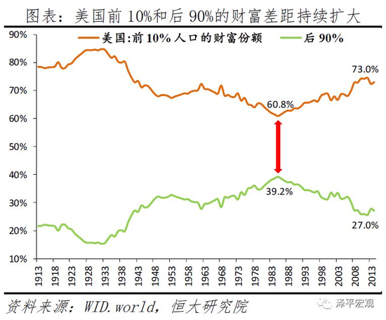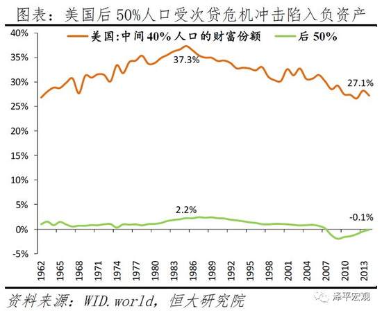 2)美国财富分配差距持续扩大,2014年,美国前1%的人口拥有38.6%的总财富,后50%的人口仅拥有-0.1%的总财富,后50%的人口受次贷危机冲击陷入负资产。