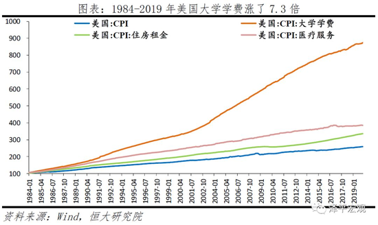 7)美国大学学费快速上涨,助学贷款负担沉重。1984-2019年,美国CPI涨了1.5倍,住房租金涨了2.2倍,医疗服务涨了2.7倍,大学学费却涨了7.3倍。