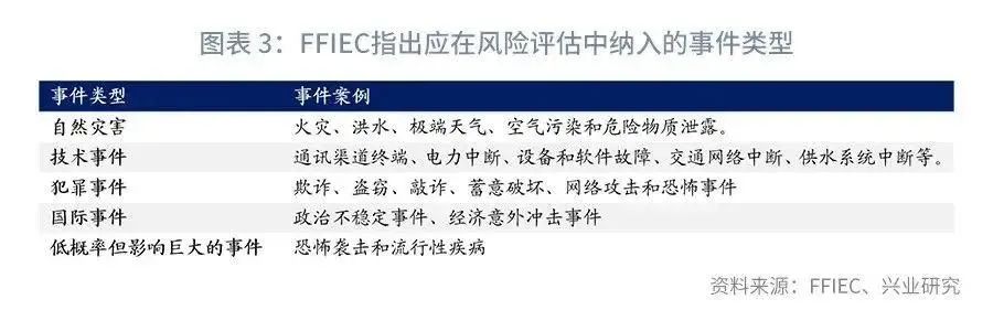 风险评估(Risk Assessment)可以大体分为两大部分:首先,是风险的识别(Risk Identification)。《手册》指出,管理层在进行风险评估时,应该关注机构整体的韧性情况。具体的风险种类可以被分类为多种,FFIEC指出,在进行监管检查时,检查者应应特别注意金融机构是否已经将下列事件包括在了风险评估之中:一是自然灾害,例如火灾、洪水、极端天气、空气污染和危险物质泄露。二是技术事件,例如通讯渠道中断、电力中断、设备和软件故障、交通网络中断、供水系统中断等。三是犯罪事件,例如欺诈、盗窃、敲诈、蓄意破坏、网络攻击和恐怖事件。四是国际事件,例如政治不稳定或经济意外事件。五是低概率但潜在影响巨大的事件,例如恐怖袭击和流行性疾病。不过管理层可以针对不同风险的同类影响制定单一的业务连续性计划,而不用针对每种特定风险都制定一个特别的计划。此外,在风险评估中,FFIEC指出公司管理层有几个特别需要注意的方面:一是管理层应评估公司所在地地理位置的潜在风险。例如若公司的位置位于洪水多发区、地震带、飓风或龙卷风多发地带、容易成为恐怖袭击目标等。除了纯地理的因素,管理层也应该注意潜在的地缘政治风险,例如在容易受美国制裁的国家展业可能造成附加的合规风险。二是管理层应统筹协调公司整体的风险评估。金融机构内单一业务部门或条线应与其他部门进行充分协调来更准确的判断对金融机构整体的潜在系统性风险。三是管理层应识别和评估网络安全风险。网络安全风险可能会对客户信息的安全性产生危害,进而导致金融机构违反监管规定。四是管理层应与外部机构协调以充分获取潜在威胁的信息。这些外部机构包括行业的信息分享机制、地方政府或政府部门的应急管理小组。而在金融机构内部充分的信息分享也可以帮助机构整体更为系统和准确的识别评估风险。五是管理层应关注与第三方服务商关联过紧的潜在风险。如果金融机构与第三方服务商联系过于紧密(如依赖性很强),那么当发生突发事件第三方服务商所受的影响可能会产生“多米诺效应”导致金融机构业务受到重大影响。其次,是可能性和影响分析(Likelihood and Impact)。不同风险事件的可能性和影响不尽相同,例如短期的电力中断是高可能性但低影响的事件,而流行性传染病则是可能性较低但影响较大的事件,这其中最难应对的事件就是这些可能性较低但影响较大的事件。作为风险评估的重要部分,管理层应当定量的评估风险事件的潜在的财务等损失、定性的评估风险事件潜在对客户、声誉等的影响。除了评估金融机构本身遭遇风险事件的可能性和影响,管理层还应该评估重要的第三方服务提供商遭遇风险事件的可能性和影响。